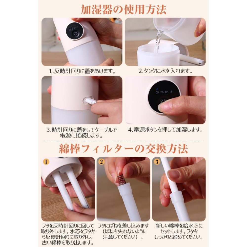 【超音波式加湿器 & 掃除しやすい 】加湿器 小型は先進的な超音波霧化技術を採用しており、高周波振動によって水を微小な粒子にばらばらにし、超微細な水 の形で空気中に放出し、迅速かつ効果的に空気の湿度を高めます。その独特な霧化方式により、非常に均一な水 を生成することができます。これらの微小な水 粒子は迅速に拡散し、空間全体に均一に分布し、空間の相対湿度をバランスよく高め、局所的な湿度が高すぎたり低すぎたりする状況を避けます。また、この加湿器はユーザーの使い勝手を十分に考慮した設計で、清潔にしやすい。その構造は簡潔明瞭で、複雑な内部構造がなく、ユーザーが日常的な清掃メンテナンスを容易にする。各部品間の接続設計は合理的で、簡単に取り外すことができ、ユーザーは清水で洗うだけで水垢や汚れなどの不純物を取り除き、加湿器が常に良好な動作状態と衛生状態を維持することを確保することができる。