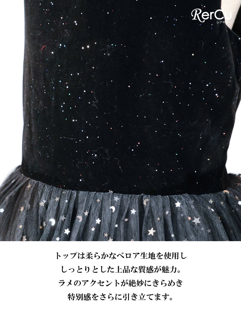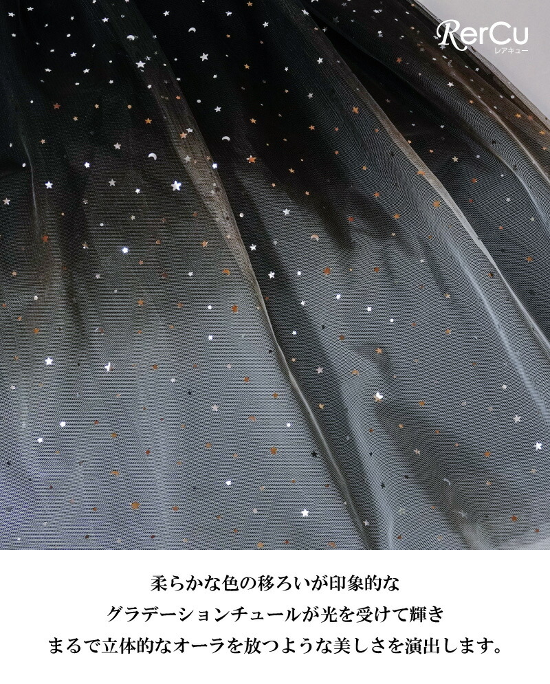 スカート部分には、サテン生地の上にグラデーションチュールを重ね、無数の星や月のスパンコールが煌めきます。動くたびにきらめくデザインは、どの角度から見ても目を奪われます。