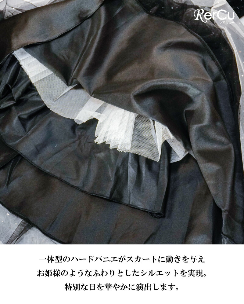 一体型のハードパニエがスカートに動きを与え、お姫様のようなふわりとしたシルエットを実現。特別な日を華やかに演出します。