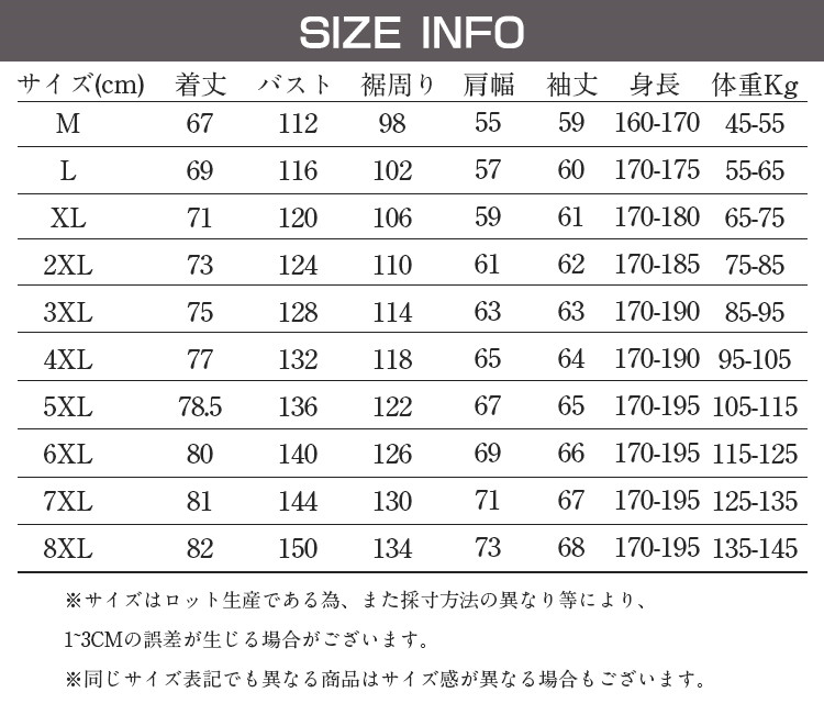 サイズ: M L XL 2XL 3XL 4XL 5XL 6XL 7XL 8XL