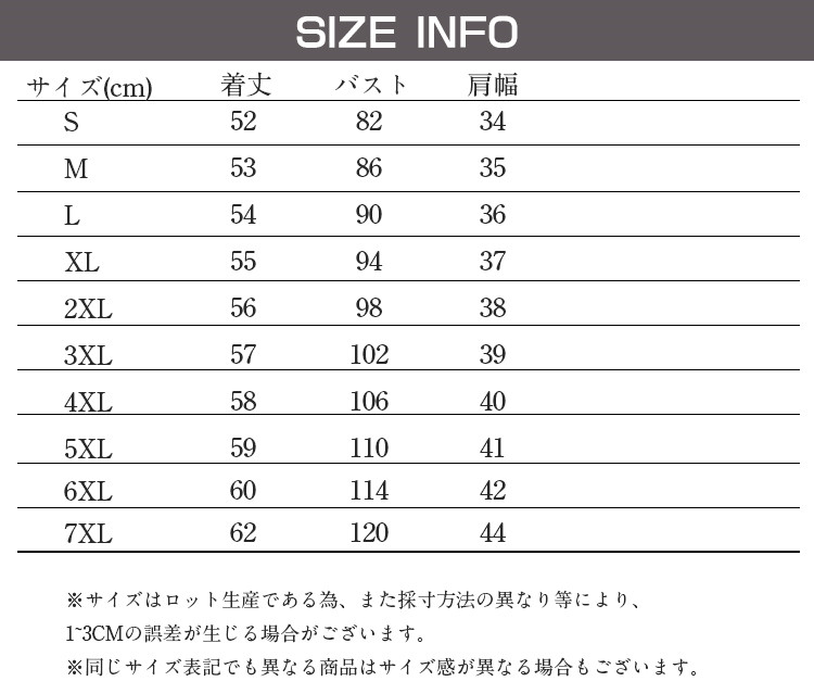 サイズ: S M L XL 2XL 3XL 4XL 5XL 6XL 7XL