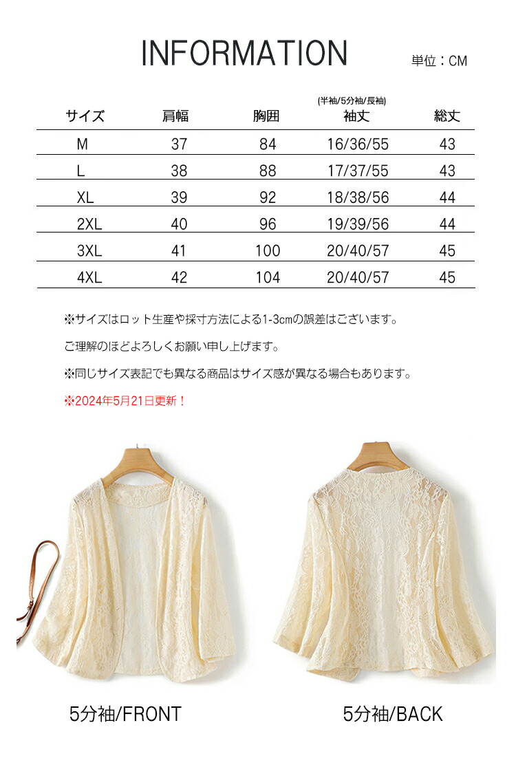 ※お取り扱い前に、商品付属タグの記載もご確認下さい。特徴※ワンピースやドレスと合わせやすいレースデザインのボレロ。フラワーモチーフのレースは、大人可愛いスタイルを叶えます。※半袖/七分袖/長袖3丈が選べる、気になる二の腕もさりげなくカバー。レースの透け感がきれいめシルエットを演出します。※総レースのフェミニンでエレガントな大人可愛いパーティーボレロです。※使わない時は折り畳んでコンパクトに収納できるのも魅力です。※結婚式や二次会、パーティー、発表会、普段のワンピースの羽織りなど、あらゆる場面でマルチに活躍してくれます。平日着用でもOK!