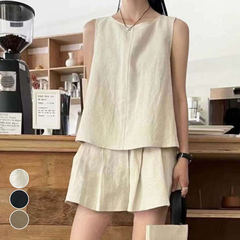 リネン セットアップ 上下セット ノースリーブ トップス ショートパンツ ルームウェア セット 2点セット