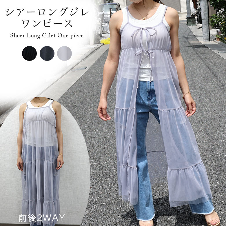 2B30 前後2WAY シアーメッシュ ロング丈チュールキャミワンピース シアー ロングジレ ワンピー レディース 春 夏 透け感 重ね着 オシャレ シアー素材 涼し気 ワンピ ジレ 体型カバ 肌見せ