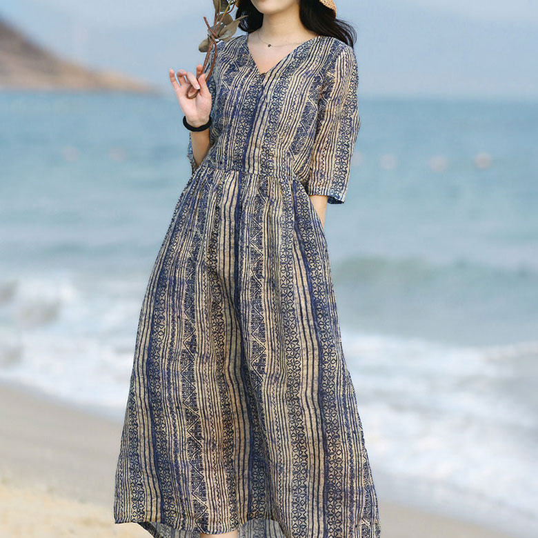 2A19 ワンピース レトロ レディース ロングワンピース ストライプ 清楚 きれいめ お洒落 かわいい カジュアル ゆったり Vネック ワンピ 夏 サマーワンピース 韓国ファッション 春