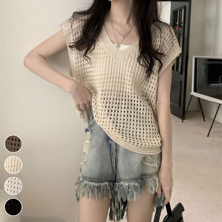 2B3 Vネック メッシュ ニット セーター レディース 春 夏 重ね着 透かし編み 透け感 UV対策 日焼け防止 日差し避け ゆったり 透かし編みトップス きれいめ お洒落 韓国ファッシ カジュアル