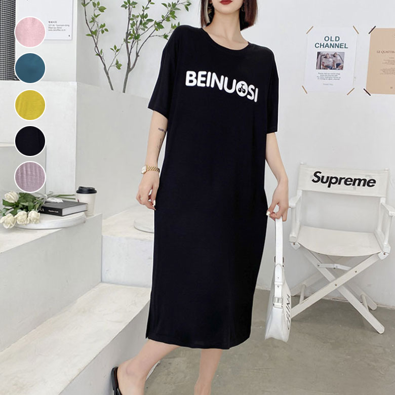 Tシャツ ワンピース レディース ロングワンピース ロゴワンピース ひざ丈 お洒落 きれいめ シンプル カジュアル 半袖ワンピース 夏 ゆったり リラックス 韓国ファッション サマー