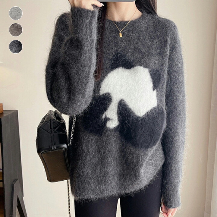 1K モヘアニット セーター パンダ レディース 秋 冬 起毛 ジャガード パンダ柄 ニットセーター 長袖 柔らかい 暖かい ルーズシルエット パンダセーター 韓国ファッション ゆったり