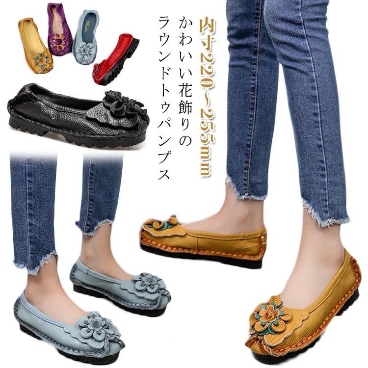 フラットヒール ローヒール パンプス フラットシューズ スリッポン ぺたんこ 牛革 ラウンドトゥパンプス 花 女性 エスニック風 かわいい フラワー ワイド 大人 大 幅広