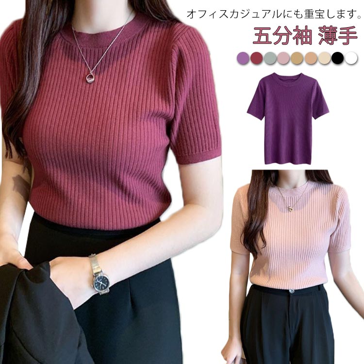 リブニット きれいめ サマーセーター 五分袖 ニット サマーニット カジュアル オフィス 半袖ニット 薄手 シンプル クルーネック トップス ストレッチ 春 夏 通勤 おしゃれ カジ 秋