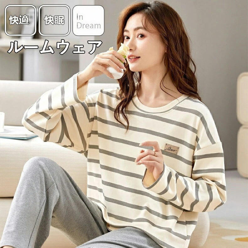 パジャマ レディース ルームウェア 長袖 部屋着 上下セット プレゼント用 可愛い ゆったり ストライプ 肌に優しい 女性 寝間着 春夏秋冬