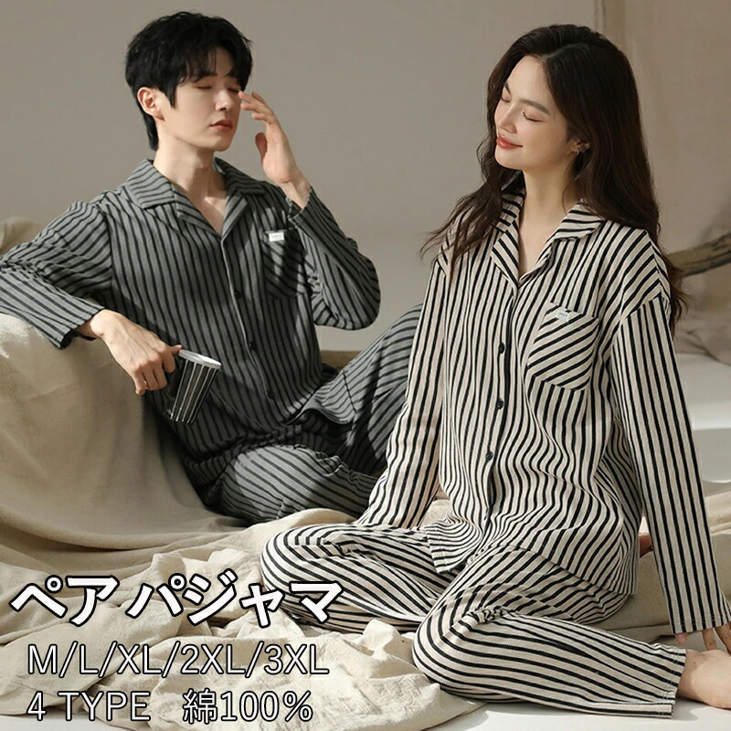 パジャマ レディース メンズ 冬 冬用 ペア 綿100% しま模様 ルームウェア 大きいサイズ M~2XL かわいい 長袖 秋 外出 結婚祝い プレゼント 可愛い カップル コットン メ