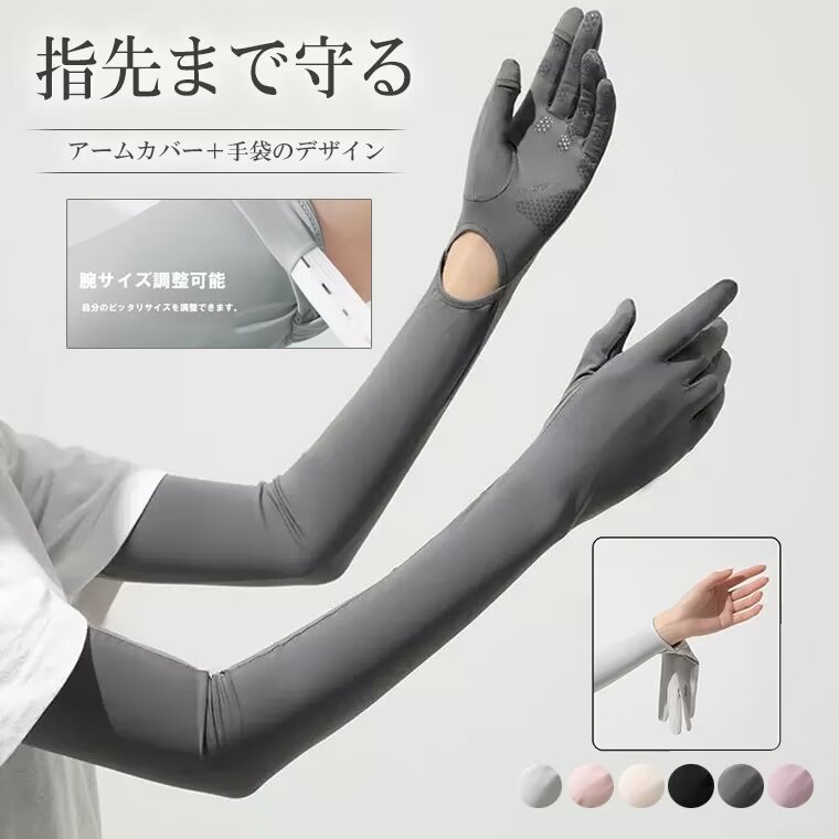 袖が短い服を着いても指先から腕まで日焼けからガード 全6色 ロング丈 ひんやりアームカバー グローブ 手袋 腕カバー 日焼け止め UVカット 指先まで 肘まで 日焼け 冷感 アウトドア 運転 自転車