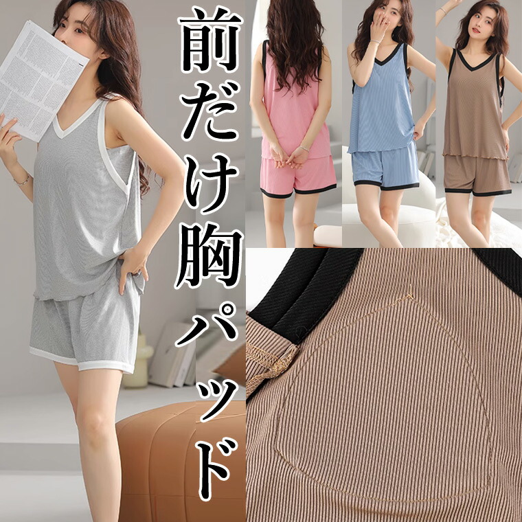 脇下カバーでだらしなくない 上下セット 柔らかもっちり パット付タンクトップ ショートパンツ Vネック アンダーフリー ゴムなし ブラトップ 締め付けない 前のみ パッドのみ 固定 ルームウェア カッ