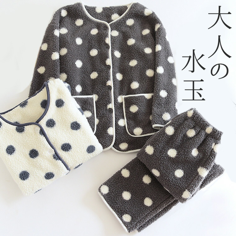 大人の水玉 両面ボア 40代 50代 ドット 裏ボア フリース パイピング 軽量 襟なし ノーカラー ルームウェア ふわふわ モコモコ 上下セット あったかい 起毛素材 パジャマ 軽い
