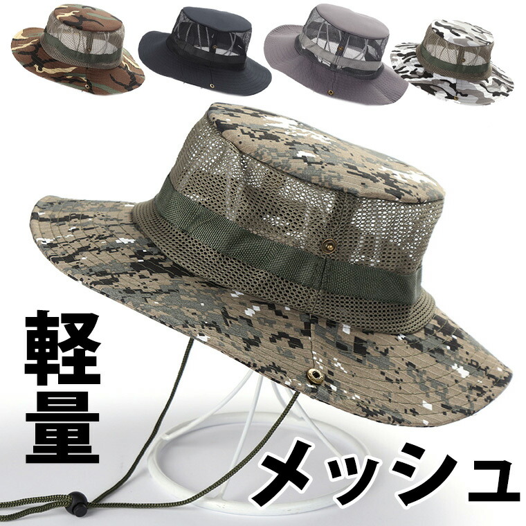 風を通して涼しい メッシュハット お洒落なアーミーカラー 迷彩カラー バケットハット サファリハット キャンプ アウトドア メンズ レディース 軽量 速乾 カモフラ カーキ サンド ツバ広 おしゃれ