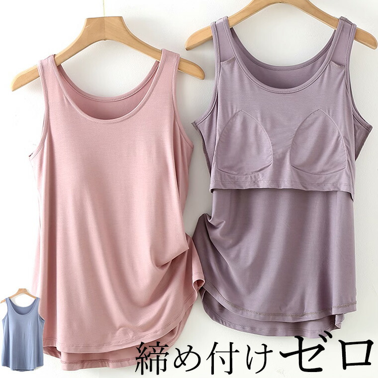 締め付けない ズレない パット付 くすみカラー タンクトップ ラウンドネック アンダーフリー ゴムなし ブラトップ 前のみ パッドのみ 固定 ルームウェア カップ付き インナー 袖なし 袖無し