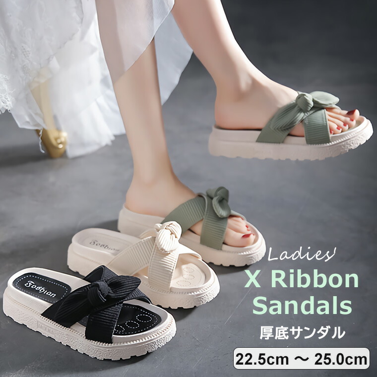 サンダル 厚底サンダル クロスリボン シューズ レディース 厚底 ソール約4.5 ビーチサンダル フリルサンダル サマーサンダル 無地 カジュアル オシャレ スリッパ 全3色