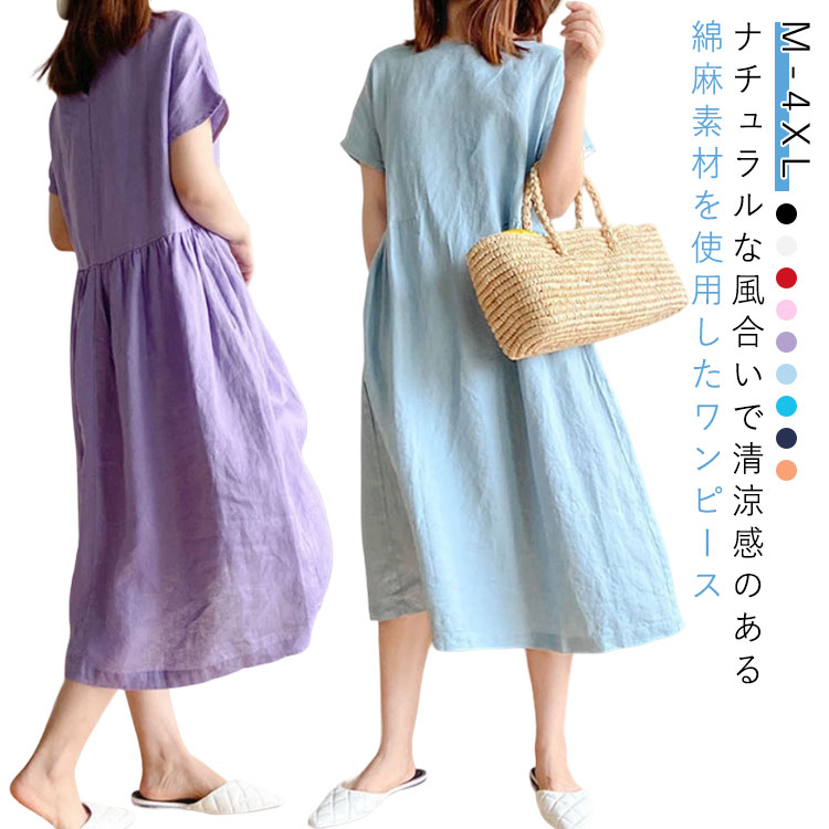 夏 部屋着 春 無地 レディース シンプル ゆったり ロング丈 きれいめ 半袖 リネン 着痩せ 洋服 涼しい 体型カバー 大きいサイズ ナチュラル 通気性 ワンピース カジュアル 婦 大人