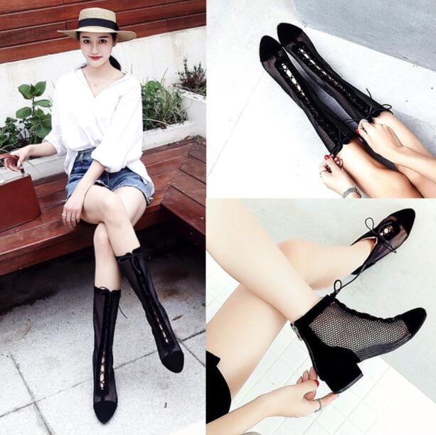 サマーブーツブーツサンダル 選べる2丈 ロングブーツローヒールサンダル太ヒール夏シースルー3センチヒール透かしレディース靴