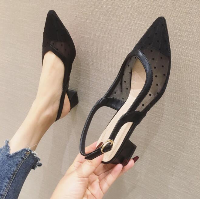 パンプス レディース ドット柄シースルーパンプスローヒール ストラップ ポインテッドトゥ ぺたんこ 3 柔らかい 痛くない 歩きやすい