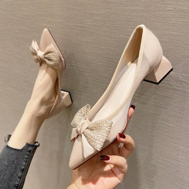 走れるパンプス 痛くない 歩きやすい ニットパンプス 楽 チャンキーヒール ポインテッドトゥ パンプス レディース 4CM シューズ ニット素材