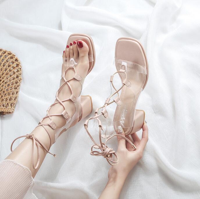 クリアサンダル美脚サンダルアンクルストラップ付きサンダルクリアサンダル レースアップ レディース 6ヒール クリアサンダル 海 リゾート