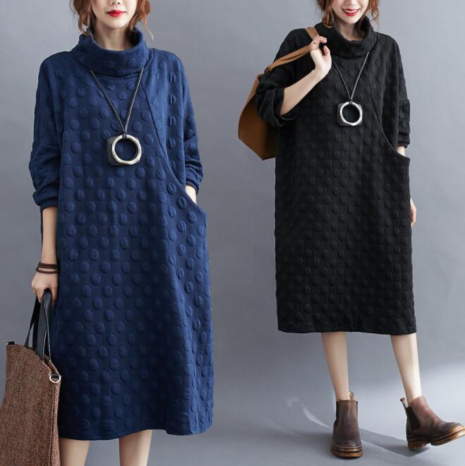ワンピース レディース 秋冬 ロングワンピース ハイネック厚手 長袖 綿混ワンピース ミモレ丈 体型カバー ゆったり 大きいサイズ 無地