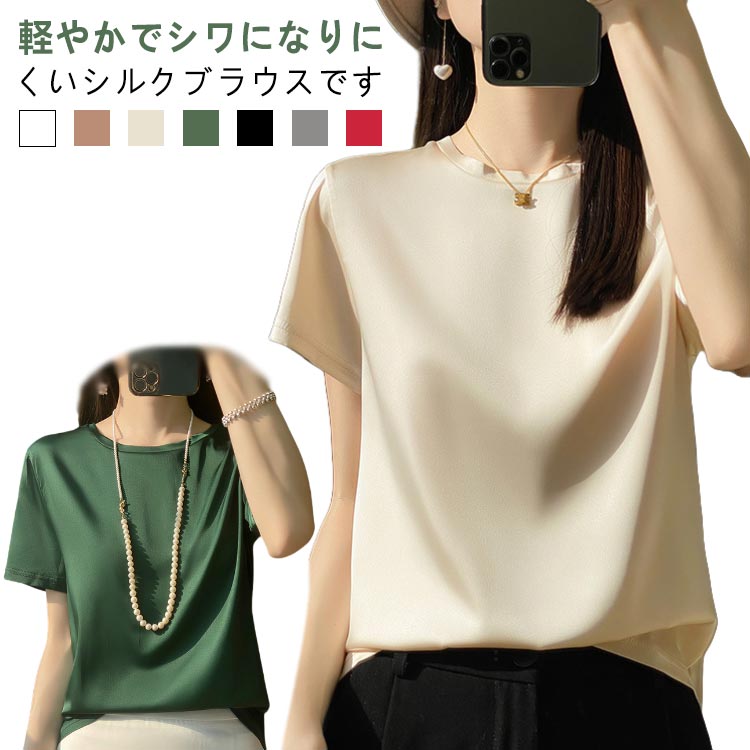 シルク混 サテンシャツ ゆったり サテンブラウス シルクブラウス 光沢 サテンブラウス クルーネック 半袖シャツ 半袖シャツ 楽チン レディース 春夏 20代 30代 40代 シルクシャツ