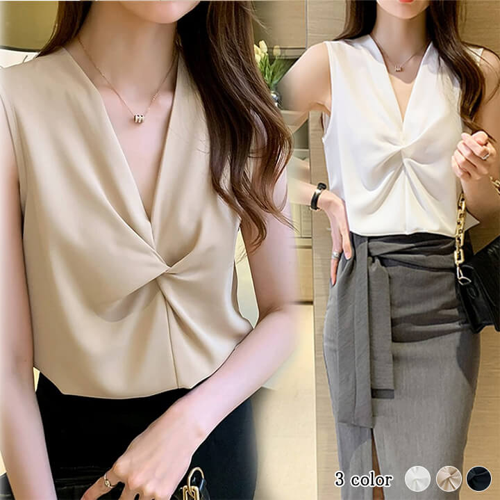 2B5 サテンノースリーブブラウス 胸元ねじりブラウス トップス キャミソール インナー レディース ノースリーブ