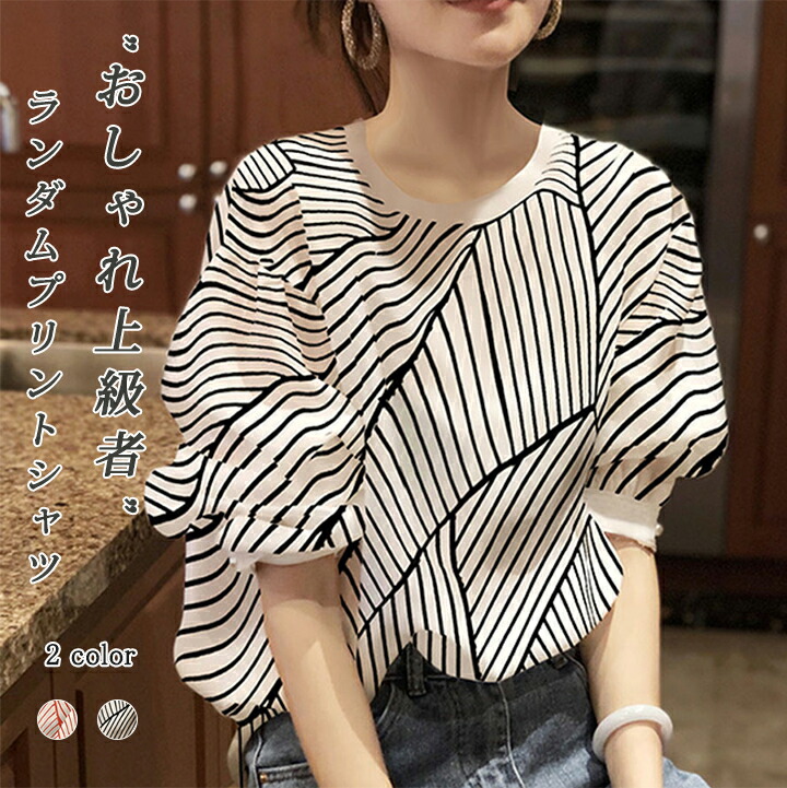 2B5 ランダムプリント半袖総柄シャツ ブラウス 幾何模様 半袖ブラウス Tシャツ レディース ボリューム袖 二の腕カバー カジュアル 幾何 バーゲン モノトーン 可愛い