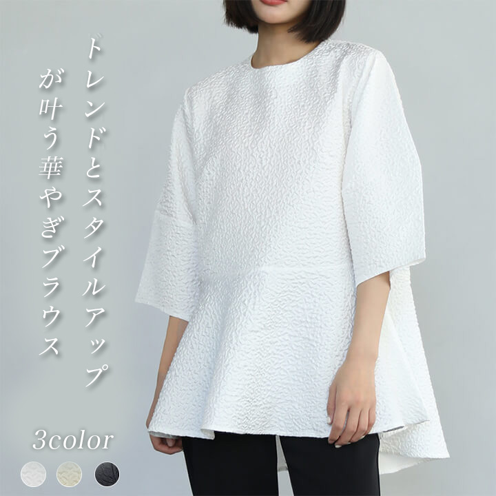 2A51 ふくれジャガードペプラムトップス ジャガードペプラムカットソー トップス 凹凸 レディース ブラウス半袖トップス半袖Tシャツ ゆったり Aライン きれいめ 大人 体型カバー 上品