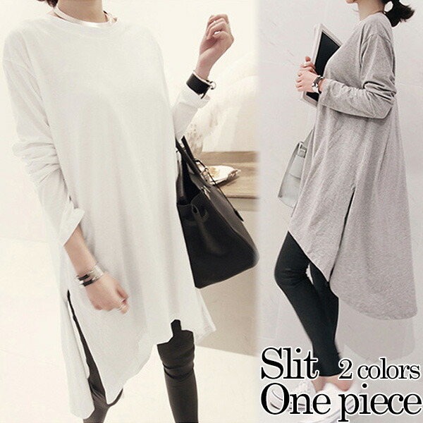 2A47 スリットTシャツワンピース ロングワンピース ミティアム丈ワンピース カットソー Tシャツ 斜め ホワイト グレー体型カバー 春 着痩せ 30代40代 バーゲン ワンピ