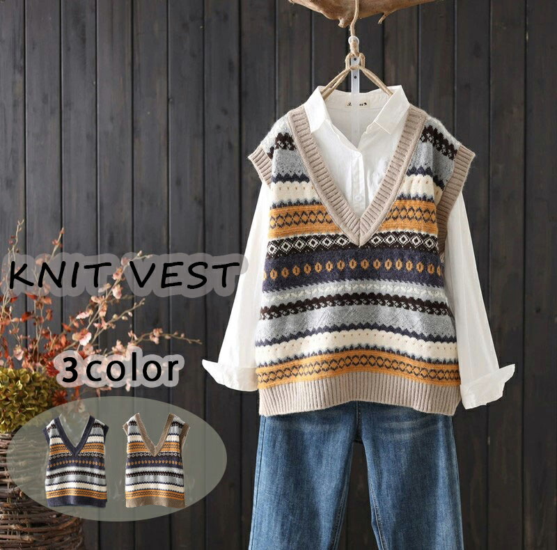 3B-2ニットベスト ジャガードニットベスト セーター 幾何学柄 Vネック ニットベスト 韓国 トレンド 秋冬