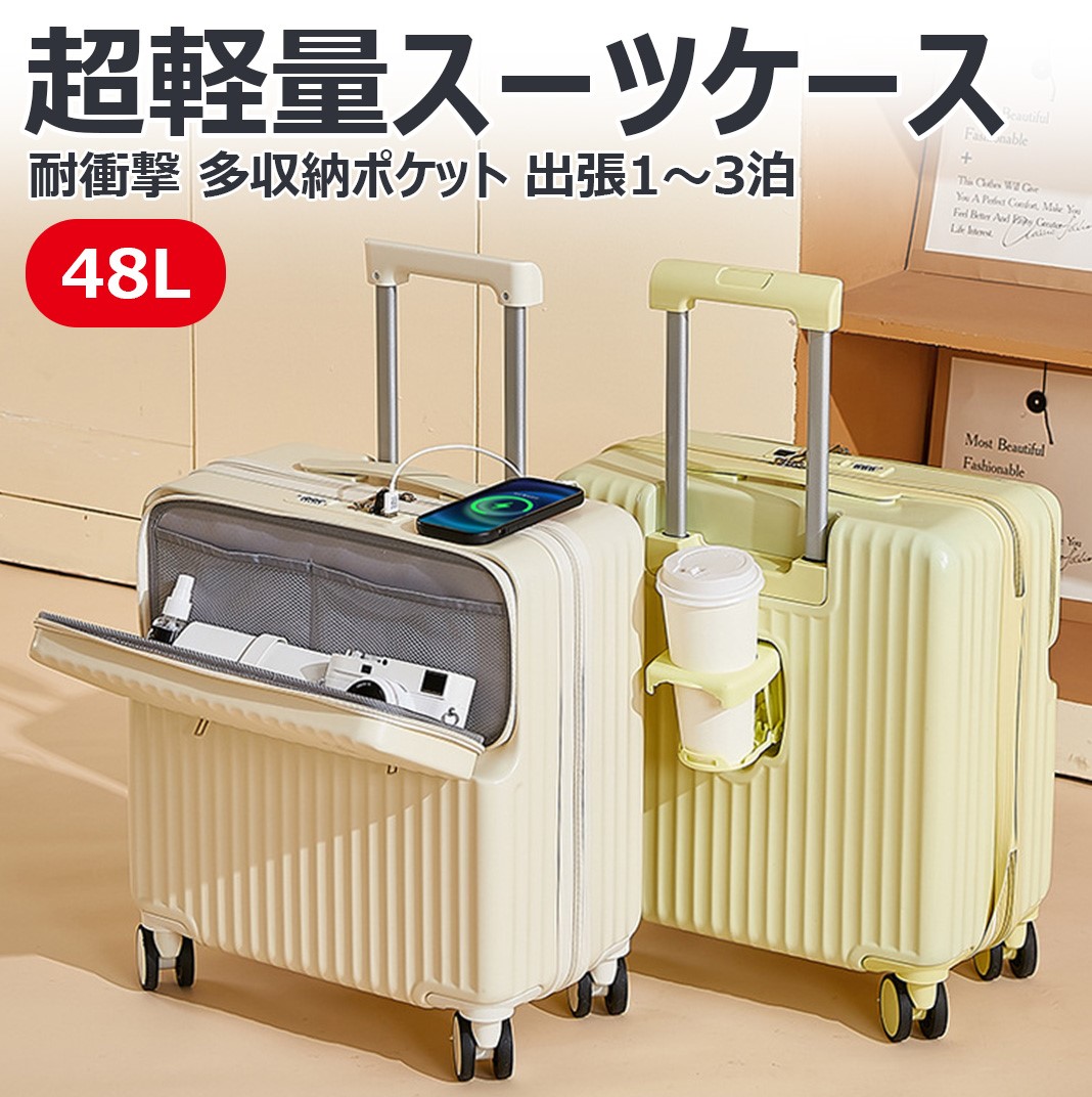 フロントオープン スーツケース 大容量 多機能 多収納 静音 充電 軽量 出張 旅行 衝撃耐性 カップホルダー