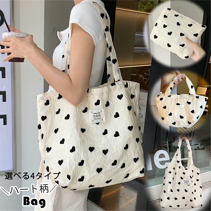 1B10 ハート柄バッグ 選べる4タイプ 大容量 舟型トートバッグ ポーチ お買い物 エコバッグ 折りたたみバッグ シンプル 無地バッグ 便利アイテム 折りたためる