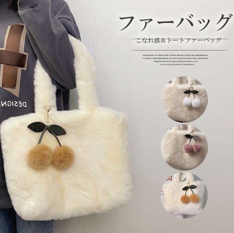 秋冬の季節感が出せる ファーバッグ トートバッグ エコファー ハンドバッグ フェイクファー スクエア型 柔らかい さくらんぼストラップ付き 肩掛け 秋冬大容量 軽量 軽い 通勤 通学 可愛い おしゃれ