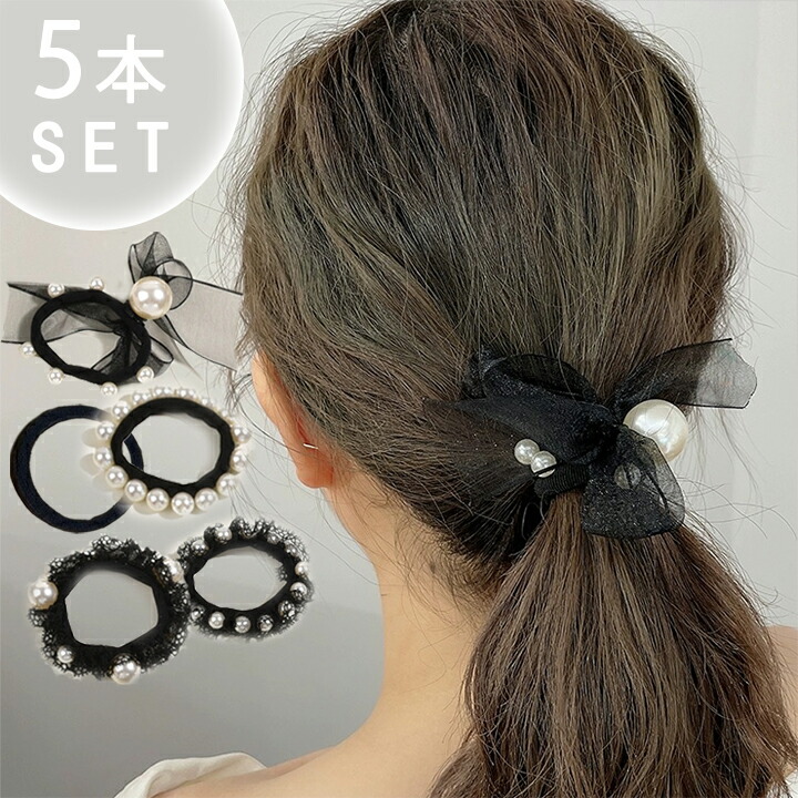 パールヘアゴム5本 セットレース パール 大人っぽい パールゴム おしゃれ かわいい 大人 シンプル キッズ 女の子 子ども 娘 お揃い 可愛い ビジュー 黒 飾りなし 腕 ブレスレット髪ゴ 飾り付き