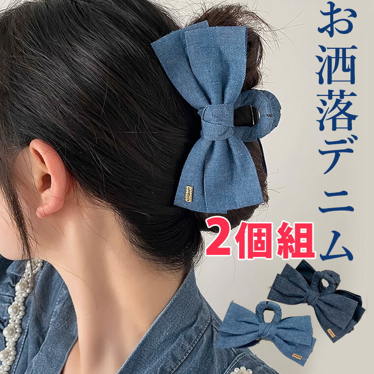 2個セット 特大リボン デニム インディゴ はさむだけ クラシック ツイード モチーフ ブランド マーク クリップ 大きめ 高見え セレブ クラシカル ビッグリボン バレッタ ラインストーン ヘアアク