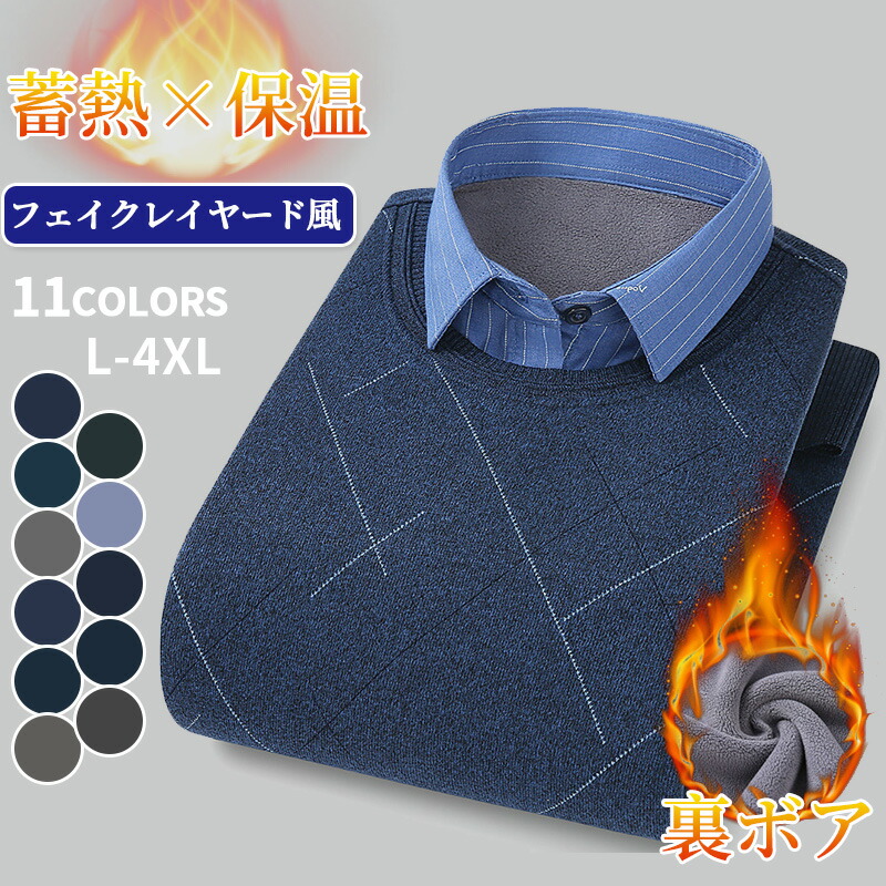 フェイクレイヤード シャツ メンズ 裏起毛 秋冬 重ね着 あったか ビジネス 紳士服 クルーネック 暖かい カジュアル 裏起毛シャツ ゴルフウエア プルオーバー ゆったり 通勤 フォーマル 保温 オフ