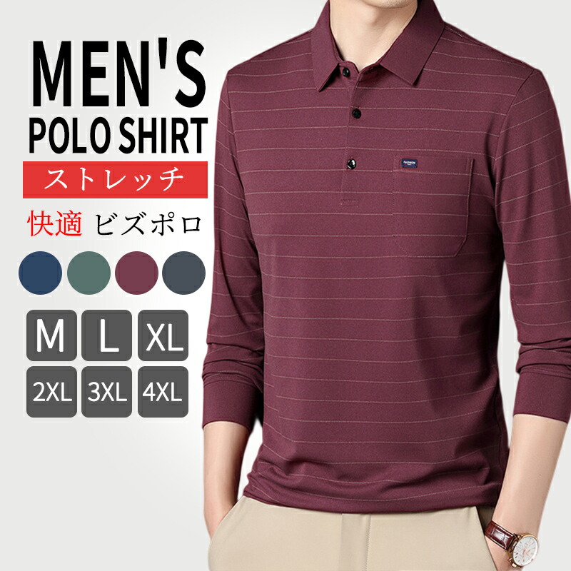ポロシャツ メンズ 長袖 秋 ストライプ 大きいサイズ ビズポロ ストレッチ ゴルフウェア カットソー ビジネス オフィス トップス フォーマル カジュアル 春 ゆったり Tシャツ 通勤