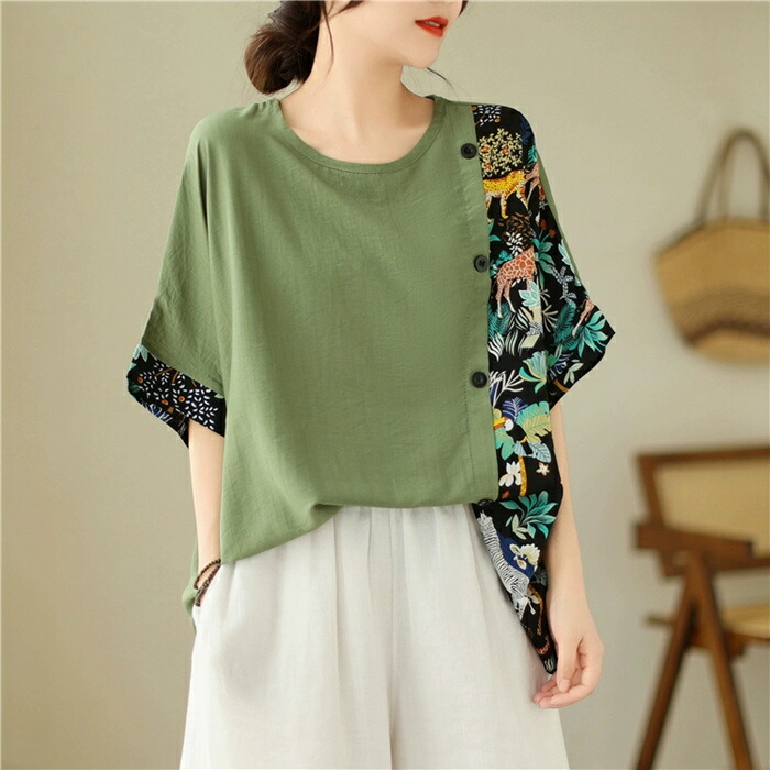ブラウス 半袖 シャツ レディース チュニック プルオーバー 花柄シャツ トップス 半袖シャツ 春夏 カジュアル きれいめ 切り替え 大人可愛い ミドル カットソー オーバーサイズ 洗える tシャツ