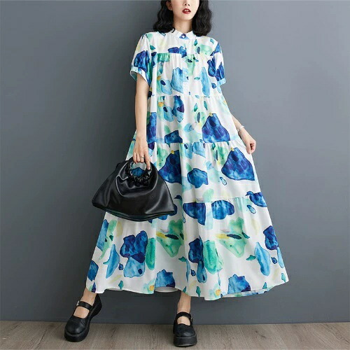 ロングワンピース マキシワンピース 夏 きれいめ 半袖 ワンピ レディース プリント 蝶々 薄手 花柄ワンピース ドレス シャツワンピース 大きいサイズ カジュアルワンピース one pi チュニック