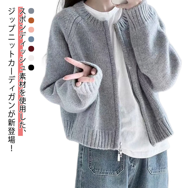 ニット カーディガン レディース ジップカーディガン ニットトップス 厚手 ノーカラー ニットセーター 羽織物 アウター コート リブニット 羽織り ショート丈 丸首 トレンド感 春 秋 体型カバー