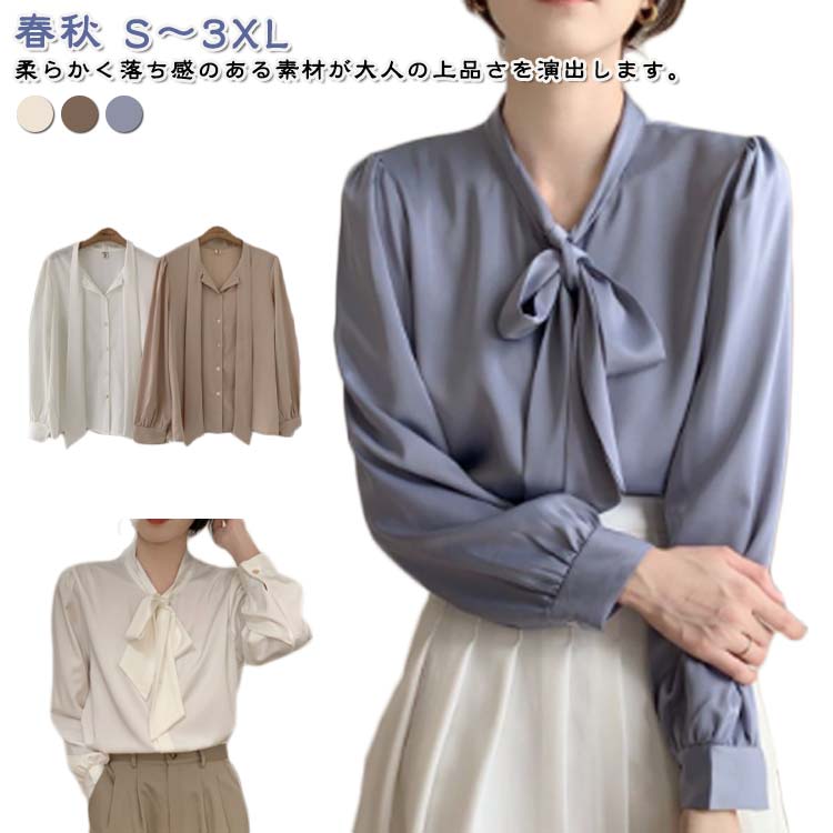大きいサイズ レディース ブラウス 長袖 通勤 オフィス シンプル 無地 リボン シャツブラウス シャツ 白 リボンブラウス OL フェミニン 春秋 フォーマル きれいめ 上品 大人女性