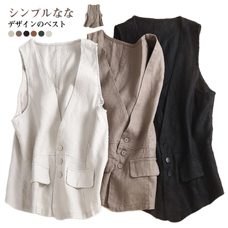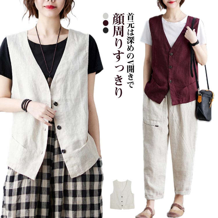 ~2 麻ベスト 前開き 薄手 ナチュラル 重ね着 春秋 カジュアル