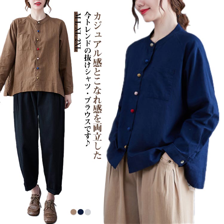 ~2 ノーカラー ブラウス 綿麻 ナチュラル 薄手 長袖 体型カバー
