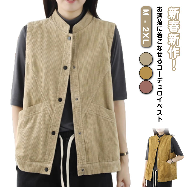 ~2 コーデュロイベスト 重ね着 前開き カジュアル ノーカラー