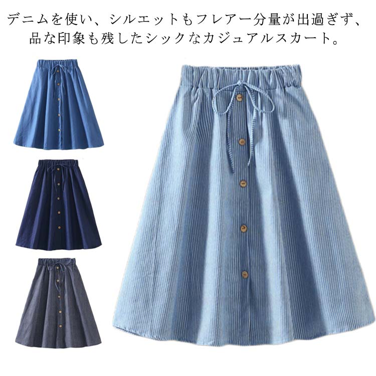 ウエストゴム スカート 体型カバー 可愛い フレアスカート レディース aライン フレア おしゃれ 脚長効果 ひざ丈 ナチュラル かわいい ハイウエスト 美脚 ボトムス 着回 フロントボタン