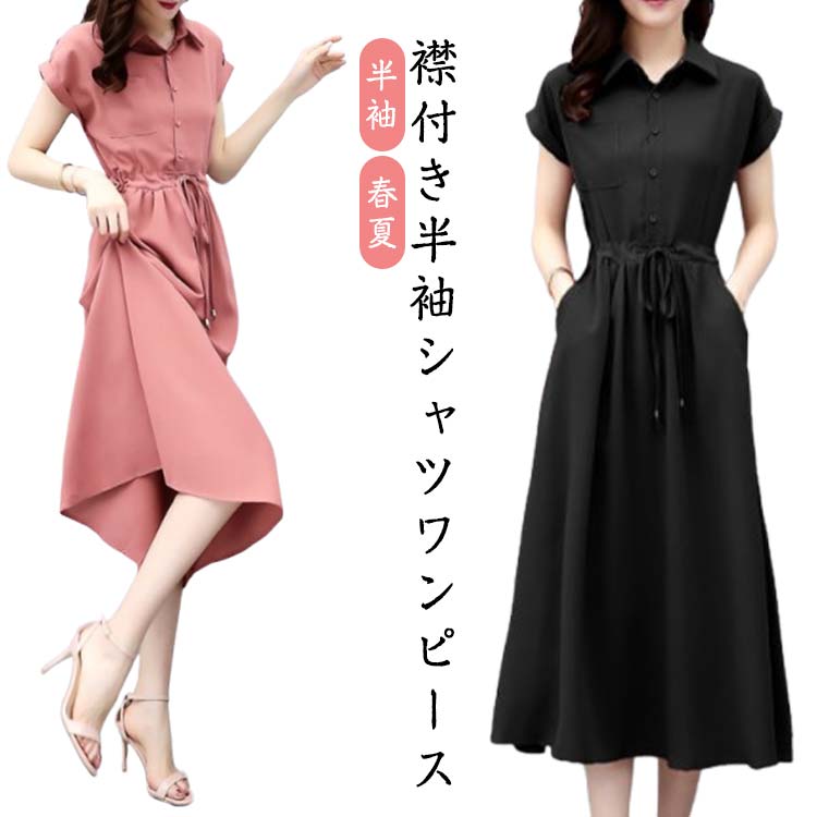 ロング ウエストマーク シャツワンピ シャツワンピース 半袖 ワンピース 半袖ワンピース 春夏 ロングワンピース きれいめ 大人 aライン フレアワンピース レディース 着瘦せ フォーマル 体型 女性